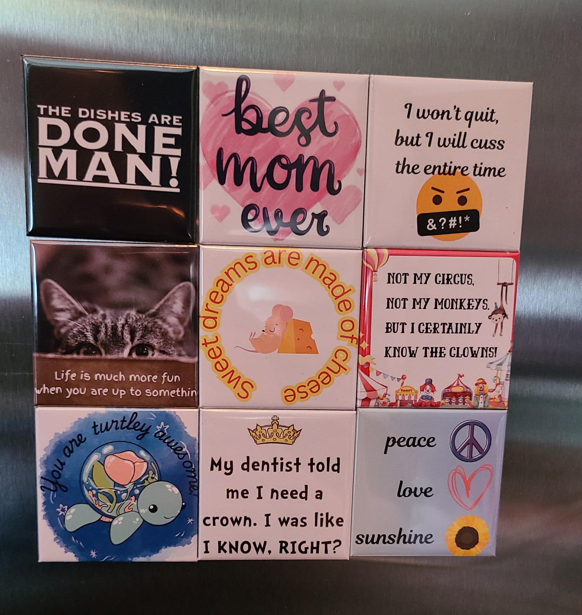 2x2 inch square magnets, 9 for just $24.99, or 3/$10, 6/$16.